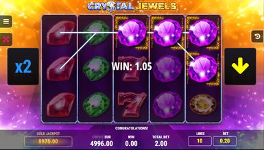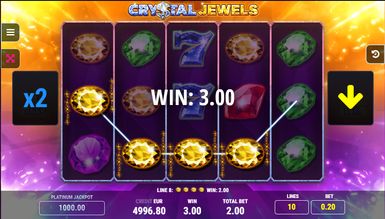 Для начисления награды в игровом автомате Crystal Jewels дождитесь выпадения призовой комбинации. Она составляется из трех и более символов одного типа. Помимо фиксированных выплат в слот-машине предложен прогрессивный джекпот. Он представлен в некольких вариантах («Diamond», «Gold», «Platinum»), выпадает рандомно.
