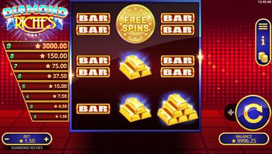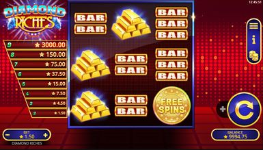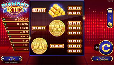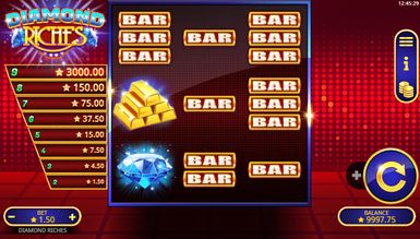Слот Diamond Riches демо представлен 3 барабанами, которые на состоят из трех рядов. Они начнут двигаться с того момента, как игрок нажмет кнопку с золотым указателем. В нижней части левой части есть раздел ставок, который позволяет изменить общую сумма на ход. Всего 21 ставка. Максимальная составляет 50 монет, а минимальная — 0,10. Параметры процесса: