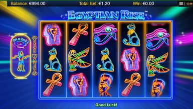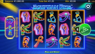 Выполнив это действие, геймер окажется на главном экране игры Egyptian Rise. Перед собой он увидит необычное исполнение заданной тематики: все символы игры на пяти барабанах, расположенных посередине экрана, нарисованы только контурами. При этом все они очень яркие и выглядят как неоновые. Все элементы игры имеют четкое отношение к заданной теме. Так же внимание играющего привлекает фон игры. Он не наляпистый и не несет никакой особой истории в себе, тем самым не отвлекаю геймера. На заднем фоне виднеются разноцветные лучи от неоновых прожекторов, исходящих из середины поля. По бокам от барабанов находится надпись, указывающая на количество игральных линий, а именно 243. С левой стороны расположился счетчик, необходимый для получения призовых наград и бонусных возможностей. Над полем игры расположился логотип Egyptian Rise. А вот под барабанами игроку встретится несколько клавиш и информационных окон. Все это служит для быстрого доступа к необходимой информации об игре и удобного управления.