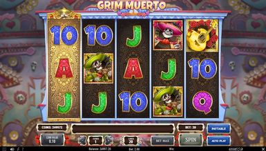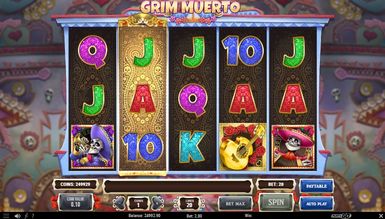 Игровой автомат Grim Muerto - развлекательный видеослот, который радует поклонников огромных количеством бонусов. Основная игра состоит из пяти барабанов и двадцати линий выплат, регулировать которые игрок может с помощью ползунка Lines. Рядом расположена опция Coins, которая позволяет сделать ставку. Минимальная ставка на одну линию - одна монета, максимальная - пять. Соответственно, на все двадцать линий можно поставить 100 монет. Bet Max ускоряет этот процесс и сразу выставляет высшие показатели в игре. Запустить прокрутки можно кнопкой Spin, а нажав Autospin, гемблер выбирает автоматический режим вращений. Во вкладке Paytable подробно описывается ход игры, специальные символы и возможности, а также таблица множителей. Очень удобно, особенно для тех, кто пришел сыграть в первый раз. Символика основной игры разнообразна - четыре музыканта из оркестра Мариачи, книга, гитара и традиционные для многих слотов карточные символы. Самым прибыльным считается гитара, собрав которую в количестве 5 на линии игрок выигрывает джекпот. К тому, гитара здесь еще и вайлд-символ, заменяющий другие, кроме разброса, для достижения призовой комбинации. Перед каждой прокруткой можно заметить, что один из квадратов подсвечивается. Фишка в том, что если вайлд-символ попадет на подсвеченный квадрат, то он расширится и заменит все символы собой.