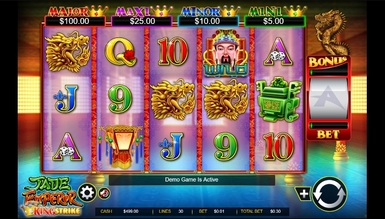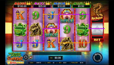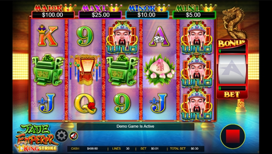 Игровой автомат Jade Emperor оснащен 5 барабанами и 30 игровыми линиями, на которых призовые комбинации составляют 5 тематических картинок и 5 стилизованных карточных символа. Они принесут выигрыши, когда 3-5 одинаковых элемента создадут непрерывное построение, начинающееся от крайнего барабана слева.