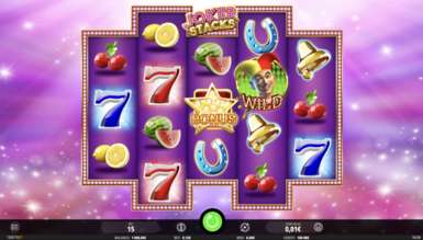 Создатели данного слота потрудили на славу. Они не просто украсили традиционную фруктовую тематику свежей графикой, как например это сделали производители онлайн аппарата Multifruit 81. Они пошли дальше и затронули интерфейс игры. На игровом поле автомата Joker Stacks, имеющем нестандартное строение (подобное было уже в слот-автомате Love Guru), фигурируют символы, которые можно отнести к разряду классических — традиционные арбузы, лимоны, вишни, а также подковы, всенепременные удачливые семерки, причем как красные, так и синие, золотые колокола. В качестве скаттера выступает золотая звезда, а улыбающийся арлекин — как раз тот самый Джокер, о котором заявлено в названии слота. То есть авторы задействовали символы классического вида, а вот правила слота претерпели кардинальные изменения. Игрокам предстоит коллекционировать картинки с доброжелательным подмигивающим джокером, чтобы получить по-настоящему солидное вознаграждение.