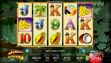 Приступить к исследованию экзотических джунглей на игровом автомате Jungle monkeys игрок может после решения ряда организационных вопросов. Изначально ему важно определится с числом линий для выплат (кнопка Lines) и объемом подходящей ставки (Bet). Проконтролировать общую сумму ставки поможет окно Total bet. Как только параметры будут выставлены, игрок может начинать розыгрыша (Spin). Также на видеослоте Jungle monkeys можно воспользоваться клавишей Auto (предварительно отрегулировав количество спинов). Она несёт ответственность за вращение барабанной установки без постоянного нажатия на кнопку Spin.