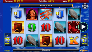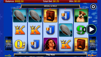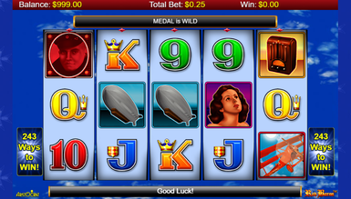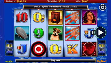 Игра Red Baron обладает отличной графикой, прекрасным музыкальным оформлением, захватывающими элементами спецэффектов и продуманным до мелочей игровым сюжетом. В качестве фона в игре выступают красивые голубые небеса со спокойными облаками. Игровое поле здесь налично в виде пяти игровых барабанов и трех горизонтальных линий. В игре нет активных линий, здесь существует 243 возможные выигрышные комбинации, именно это число и отображается с обоих боков крайних барабанов. Далее под барабанами находится строка с подсказками по геймплею. В самом низу экрана разработчики поместили панель управления, которая позволит игрокам руководить и контролировать процесс игры. В целом, оформление слота Red Baron создает приятное первое впечатление.