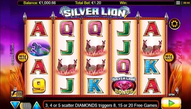 Фри-спины предоставляются при выпадении трех или более скаттеров с изображением рубина и надписями Silver Lion Bonus. 3, 4, 5 символов разброса дают право на 8, 15, 20 бесплатных ходов соответственно.