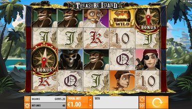 Виртуальный слот Treasure Island насчитывает 5 барабанов и 40 призовых линий. На игровой площадке символы выстроились в четыре ряда. Графическое оформление автомата полностью отражает выбранную тему. В плане графики слот легко может посоперничать с популярным игровым автоматом Booty Time, который славится впечатляющей визуализацией. Позади барабанов раскинулся тропический остров. Уютная бухта станет надежным убежищем для пиратского корабля. Высокие пальмы скроют от лучей палящего солнца, а горы от посторонних глаз. Это отличное место, чтобы оставить здесь награбленные сокровища, главное потом о них не забыть. Соответствуют выбранному стилю и символы игрового автомата. Призовые комбинации будут выстраивать портреты известных пиратов капитана Джона Сильвера и капитана Флинта, Джима Холкина, а также неотъемлемый атрибут каждого морского путешествия компас.