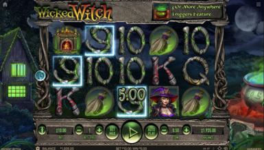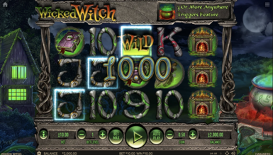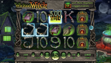 Интерфейс в игровом аппарате Wicked Witch выполнен по классической схеме. Как упоминалось выше, игровое поле здесь 5-барабанной конфигурации. Оно занимает практически все пространство на экране. Нижняя часть экрана представлена несколькими кнопками, формирующими панель управления. Линии в игре фиксированы, а потому отдельной клавиши для их настройки в автомате не предусмотрено. Что касается ставочного показателя, то для контроля над ним игрок сможет воспользоваться несколькими кнопками. Одна из них — это coin, отвечающая за номинал монеты. Вторая — это bet level позволяющая указать желаемое число монет на спин. Также присутствует клавиша bet max, которая в одно нажатие определяет максимальную ставку для игры. Вращения барабанов в этом сюжетном приключении возможно активировать двумя способами: ручным и автоматическим. Для каждого из них существует отдельная кнопка. Автоматические вращения также подразумевают контроль над их количеством. Пользователь самостоятельно определяет продолжительность автоспинов. Для ознакомления с таблицей выплат игрок может воспользоваться клавишей i.