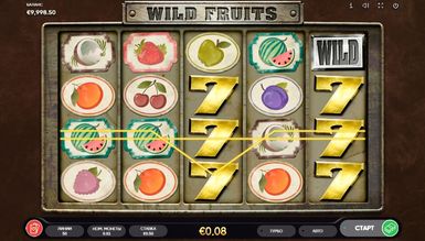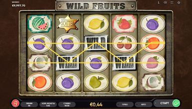 В виртуальном слоте WILD FRUITS присутствуют дикий знак и скаттер, которое вносят разнообразие в монотонное вращение барабанов и повышают финансовые показатели видеоигры. WILD легко распознать на игровой площадке, поскольку на барабанах выпадает символ с таким же названием. Он может появляться на всех барабанах, кроме №1 и заменяет недостающие символы, для завершения призовых комбинаций. Функции скаттера выполняет звезда шерифа. В спектр действий разбросанного символа попадают только 1-й, 2-й и 3-й барабаны. Одновременно появление на экране 3 звезд приносит игроку 10 бесплатных вращений. В призовом раунде по-особенному будет проявлять себя дикий знак. Он будет появляться на барабанах сразу по нескольку штук, а также полностью заполнять барабаны. Это позволить сформировать больше выигрышных комбинаций и каждое вращение сделать прибыльным. Если во время бонусных спинов выпадут 3 скаттера, тогда к оставшемуся числу вращений добавляются еще 5.