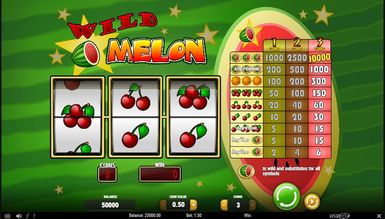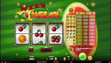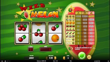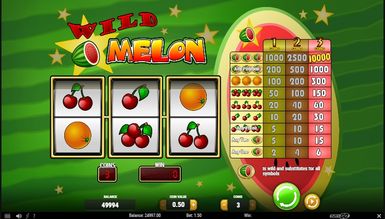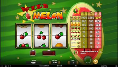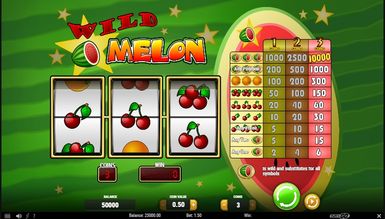 Wild Melon - показательный фруктовый видеослот. Геймплей очень сдержанный — всего по минимуму, но с высокими коэффициентами и частотой выпадения. Здесь всего одна линия и три барабана, именно такие автоматы считались прародителями современных. Минимально поставить можно одну монету, максимально — три. Выплаты производятся в соответствии с таблицей, расположенной справа от барабанов. Spin запускает вращение барабанов. Можно выбрать автоматический режим, с помощью кнопки Autospin. Он крутит барабаны до остановки пользователем. Bet Max сразу выставляет максимальные показатели в игре, а кнопка Coins регулирует ставку на линию. Символика чисто фруктовая — различные комбинации вишен, апельсин и арбуз. Все символы, кроме арбуза, срабатывают только при появлении в количестве трех на игровой линии. Арбуз — особенный символ. Во-первых, он выполняет функцию вайлда и может заметь собой любой другой, завершив комбинацию победой гемблера. Причем, этот фрукт срабатывает независимо от линии — достаточно его появления на игровом барабане. Во-вторых, это самый прибыльный символ, собрав который 3 раза одновременно на линии, игрок выигрывает настоящий джекпот в размере 10 000 монет. Если же собрать три арбуза не на линии, но в любом месте поля, выплата также произведется. И в третьих, успешной комбинацией считается даже один или два арбуза на линии.