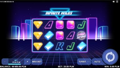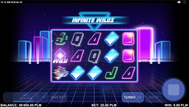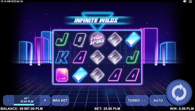 Слот Infinite Wilds сразу же привлекает внимание посетителей онлайн казино в Украине. Его визуальное оформление выполнено с помощью неоновой графики, создающей аутентичную атмосферу диско-баров 80-х годов прошлого века. С технической стороны — это стандартная модель, в оснастку которой входят 5 барабанов и 25 фиксированных линий выплат. Минимальная ставка на один спин составляет 0,01 монеты. На одну линию предлагается ставить одну монету.