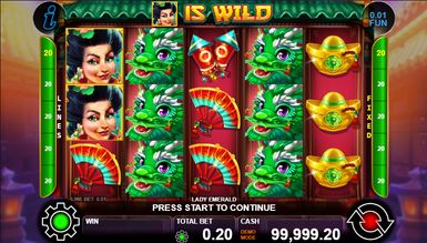 Правилами игрового автомата Lady Emerald предусмотрено два специальных символа. Знак инь-янь (Скаттер) дарит от 1 до 100 монет, оплачивается в любой позиции. Wild (образ гейши) увеличивает кредит в 0.4, 4, 10 раз и при необходимости заменяет базовые пиктограммы.